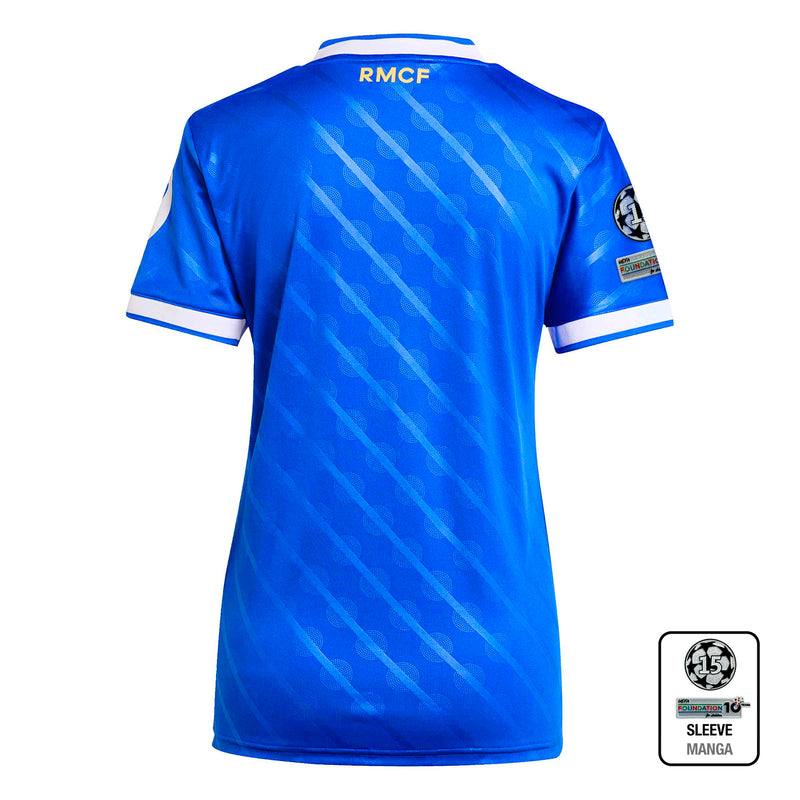 At home in blue. This Real Madrid third jersey comes in a hue that's close to the hearts of Madridistas and 3-Stripes fans. A classic adidas Originals colourway and a subtle nod to the Bernabéu's identity, it's the perfect shade to celebrate the ultimate football partnership. Serrated 3-Stripes and a Trefoil add extra adidas heritage. Moisture-managing AEROREADY keeps fans focused.